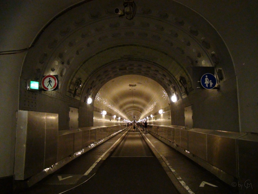 Ist man dann unten, kann man bequem unter der Elbe durchspazieren. Auch Radfahrer nutzen diesen Tunnel, um schnell einmal auf die andere Seite der Elbe zu kommen. Innen ist es durch die LĂĽftunganlage ganz schön laut – mir selbst ist es aber, als ich dort war, kaum aufgefallen – erst im Video habe ich gemerkt, dass es doch etwas lauter gewesen sein muss.